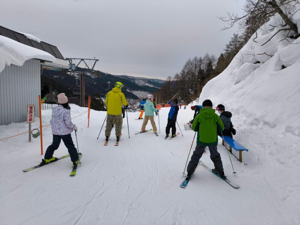 昨年、一昨年とスクールに入った子は、今年ははじめからゲレンデで滑ります。昨年学んだことを思い出しながら少しずつ滑っていきます。ある程度勘を取り戻したところで、ついにリフトデビューです。4人乗りリフトで上がっていき、初心者用コースを滑ります。緩斜面とは言え、初めての"ちゃんとした"斜面に恐る恐る挑戦。何度も転びながら滑り降り、二度目、三度目のリフトにも挑戦していきました。