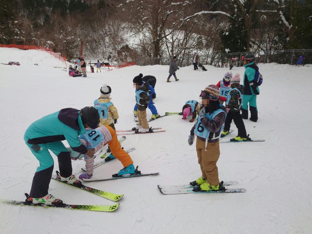 めいほうスキー場ではスキー教室に入る子、入らずにゲレンデで滑る子、キッズゲレンデで遊ぶ子など、目一杯スキー場を楽しみました。初めて雪山に来る子もいました。もちろんスキーも初めてです。スキー教室では、板のはき方から滑るときの姿勢など、基礎の基礎から丁寧に指導を受けました。