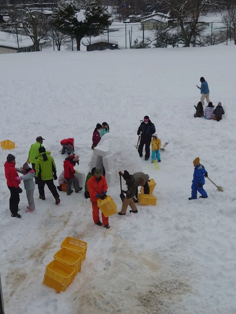 午前7時に起床し、ロールパンとフィッシュソーセージ、コーンスープの朝食を取ったあと、校庭でイグルー(かまくら)作り体験です。