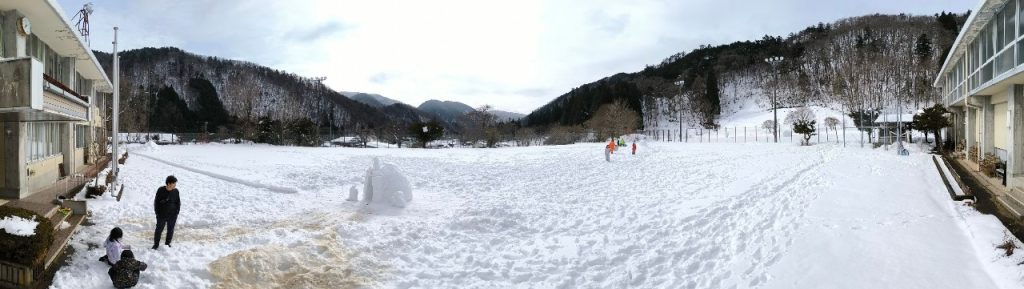 午前11時過ぎ、おっぱら到着しました。昨年は年明けに暖かい日が続き、校庭にはまったく雪がありませんでしたが、今年は直前に雪の日が続き、前日にも雪が降って素晴らしいコンディションです。