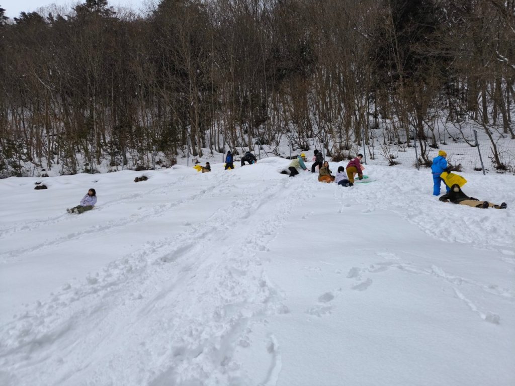 少し休憩をした後は、裏の斜面でソリ滑り等でさらに楽しみます。